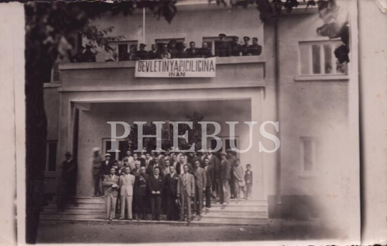 Balkonuna "Devletin Yapıcılığına İnan" pankartı, girişine ise Mustafa Kemal Atatürk portesi asılmış kamu binası önünde toplu hatıra fotoğrafı, 14x9 cm...