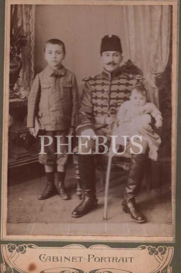 Kalpaklı Osmanlı subayı ile çocuklarının stüdyo hatıra kabin fotoğrafı, 11x17 cm...