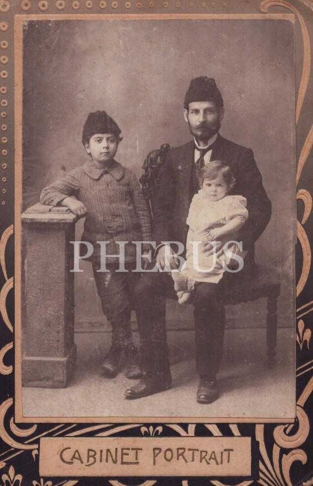 Şık giyimli, kalpaklı beyefendi ile çocuklarının 1329 tarihli stüdyo hatıra kabin fotoğrafı, 11x17 cm...