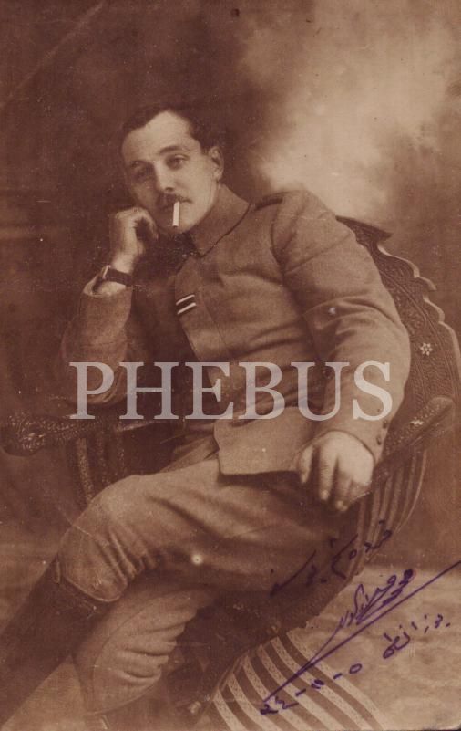 Ağzında sigarası ile poz veren Osmanlı subayının stüdyo hatıra fotoğrafı, 9x14 cm...