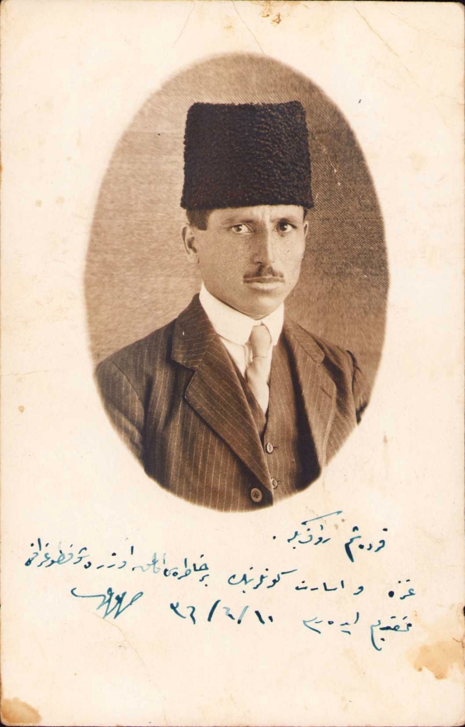 Gazze ve esaret günlerinin bir hatırası olmak üzere şu fotoğrafı takdim ederim, Bursa Sahafçılar Çarşısı, 1339 tarihli Osmanlıca ithaflı