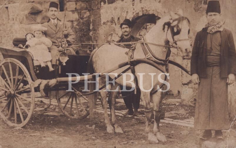 Küçük çocuğuyla faytona binen beyefendinin faytoncularla hatıra fotoğrafı, 1915, 14x9 cm...