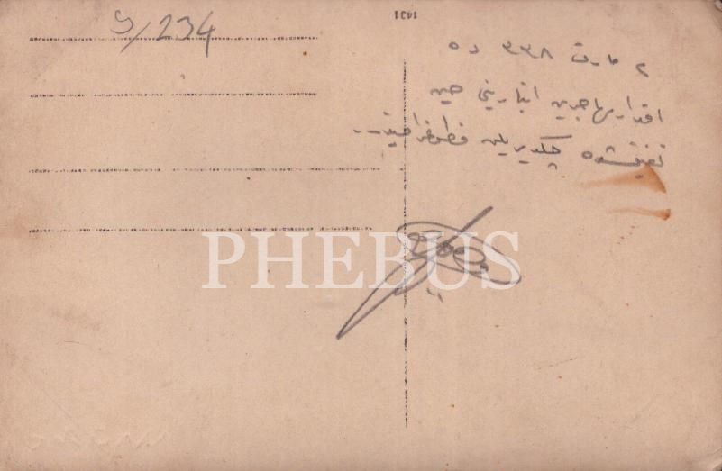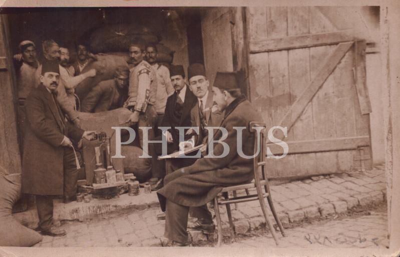 Bir ambar önünde çuvalları sırtlanan hamallar ile şık giyimli tüccarlar, 14x9 cm...
