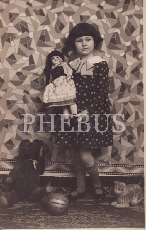 Oyuncaklarıyla poz veren küçük kızın stüdyo hatıra fotoğrafı, "Foto Moda" soğuk damgalı, 9x14 cm...