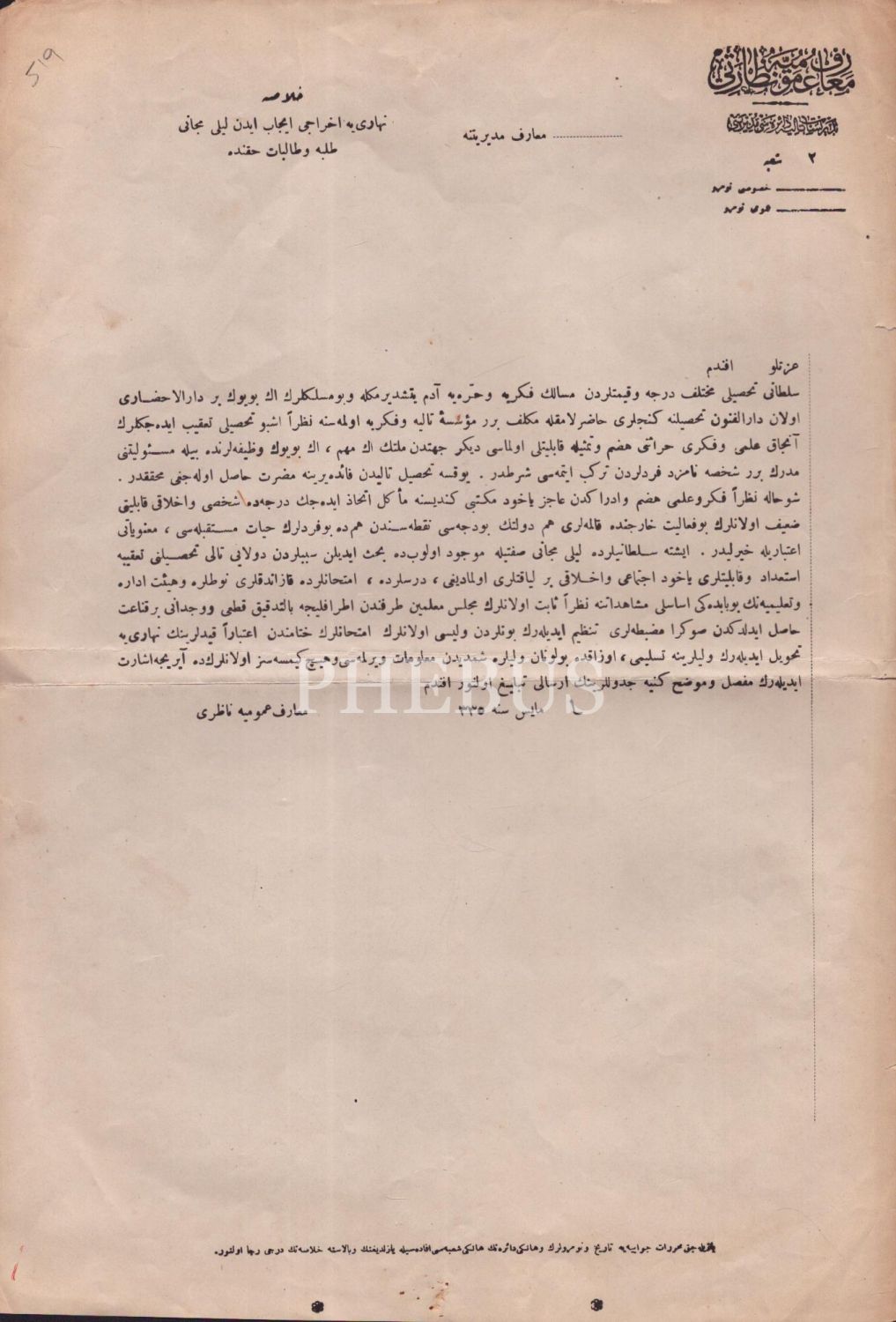Maarif-i Ummuiyye Nezareti antetli parasız yatılı şekilde eğitimine devam eden öğrencilerden hak etmeyenlerin gündüz eğitimine geçirilmesi gerektiğini bildirir yazı, 25x35 cm...