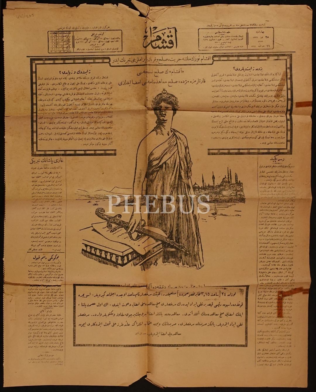 11 Zilhicce 1341 tarihli "Akşam´ın sulh nüshası" manşetli Akşam gazetesi, 4 sayfa, 55x70 cm...