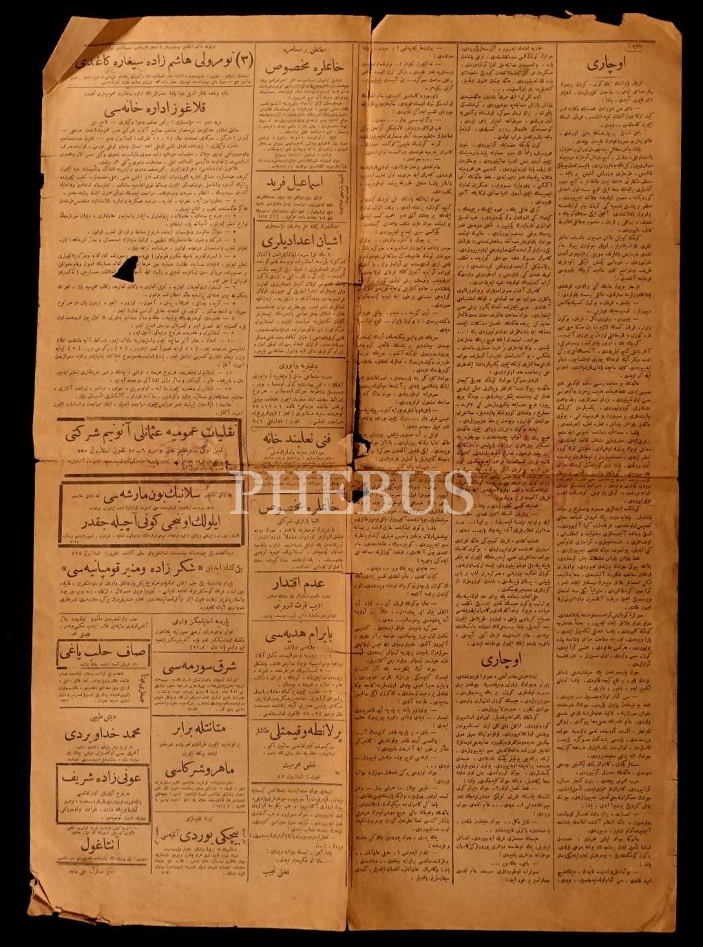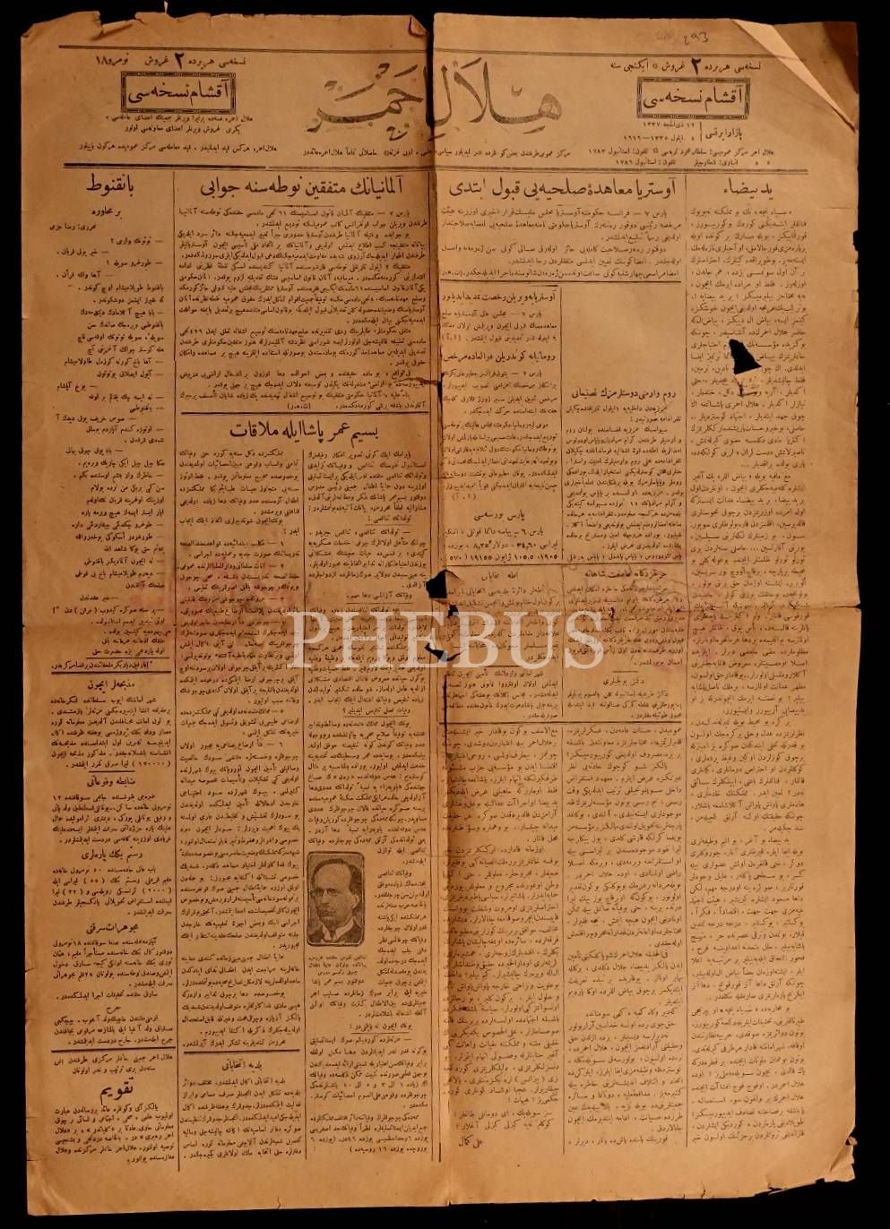 12 Zilhicce 1337 tarihli "Avusturya muahide-i sulhiyeyi kabul etti" manşetli Hilal-i Ahmer gazesi, 2 sayfa, 42x60 cm...