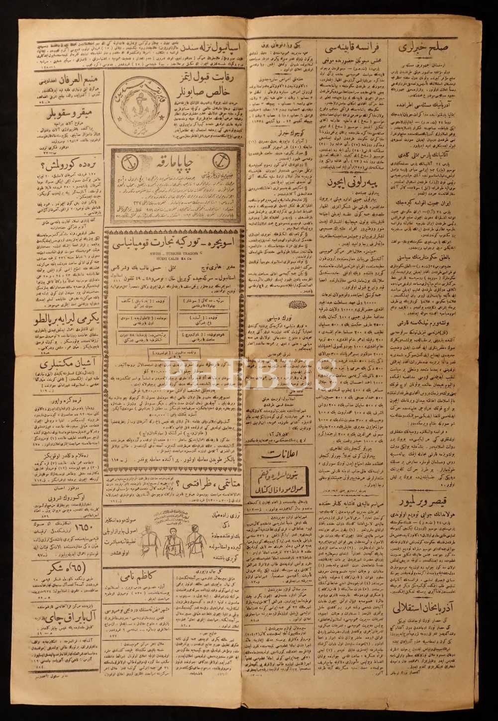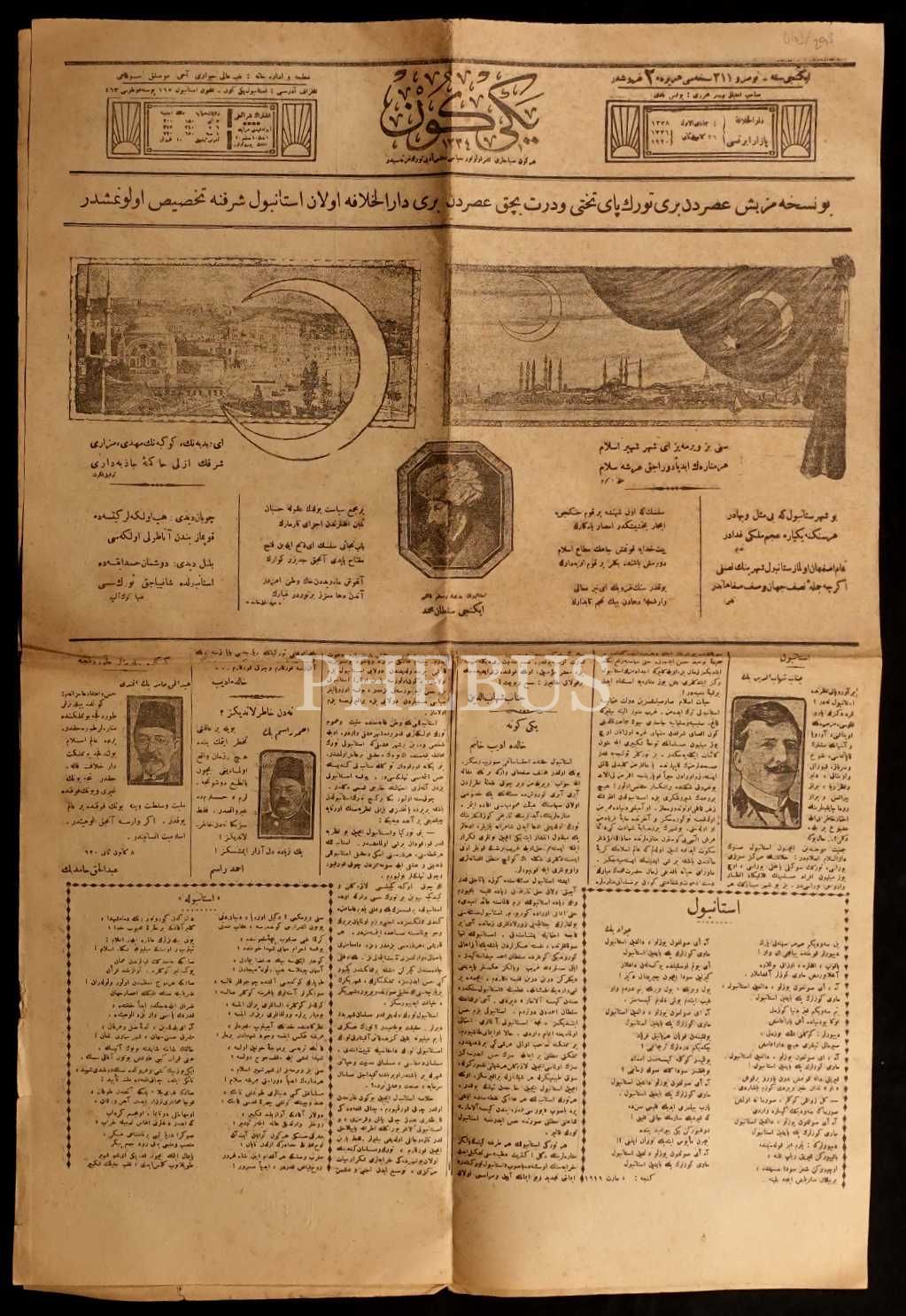 4 Cemazeyilevvel 1338 tarihli "Bu nüshamız beş asırdan beri Türk payitahtını ve dört buçuk asırdan beri Darü´l-Hilafe olan İstanbul şerifine tahsis olunmuştur" manşetli Fatih Sultan Mehmet görselli Yenigün gazetesi, 42x60 cm...