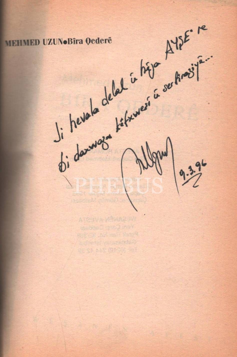 İthaf, " Ji hevala delal ü hija Ayşe´re bi daxwaza kefxweşi ü serfiraziye... 9.3.96" şeklindedir. *Kitap cildinden ayrılmıştır.