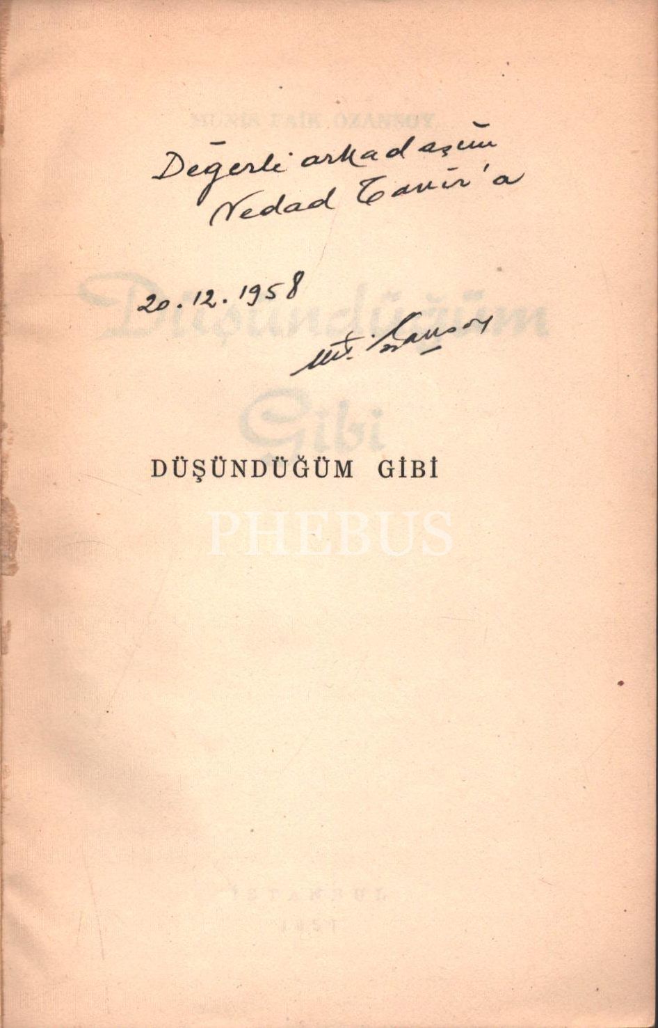 İthaf, "Değerli arkadaşım Nedad Tamir´a 20.12.1958" şeklindedir.