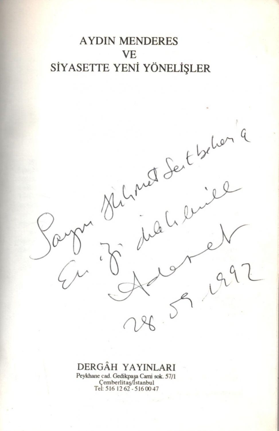 AYDIN MENDERES VE SİYASETTE YENİ YÖNELİŞLER, Aydın Menderes, Ağustos 1992, Dergah Yayınları, 261 sayfa, 13x19 cm, İTHAFLI VE İMZALI...