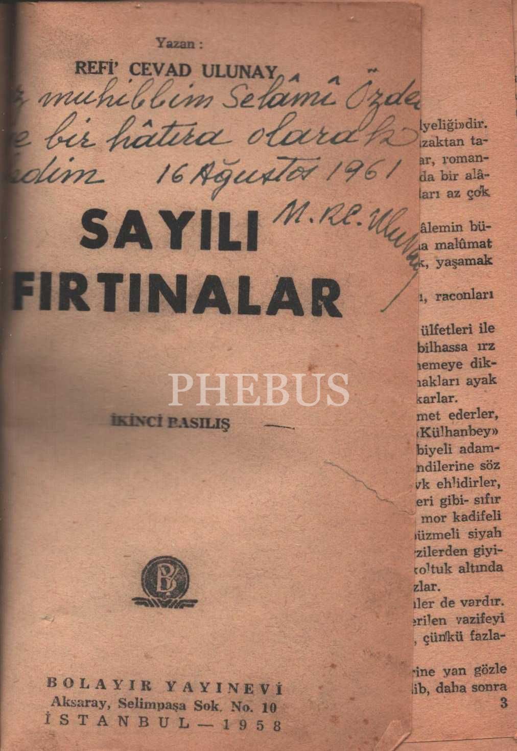 SAYILI FIRTINALAR, Refi´ Cevad Ulunay, 1958, Bolayır Yayınevi, 397 sayfa, 14x20 cm, İTHAFLI VE İMZALI...