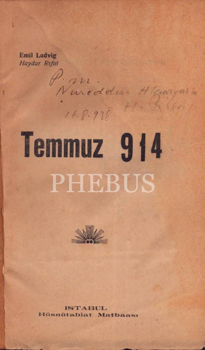 TEMMUZ 1914, Emil Lüdvig & Haydar Rifat, 1932, Hüsnütabiat Matbaası, 262 sayfa, 14x20 cm, İTHAFLI VE İMZALI...