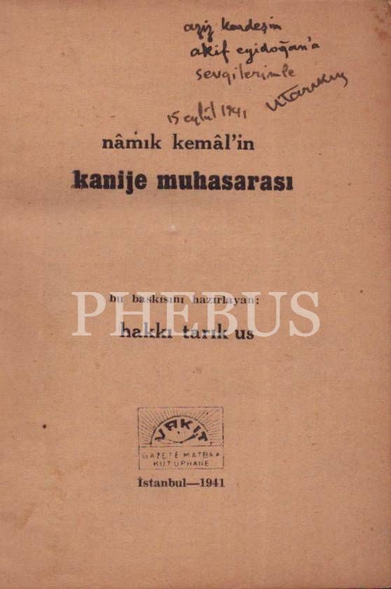 NAMIK KEMAL´İN KANİJE MUHASARASI, Hakkı Tarık Us, 1941, Vakit Gazete Matbaa, 133 sayfa, 11x15 cm, İTHAFLI VE İMZALI...
