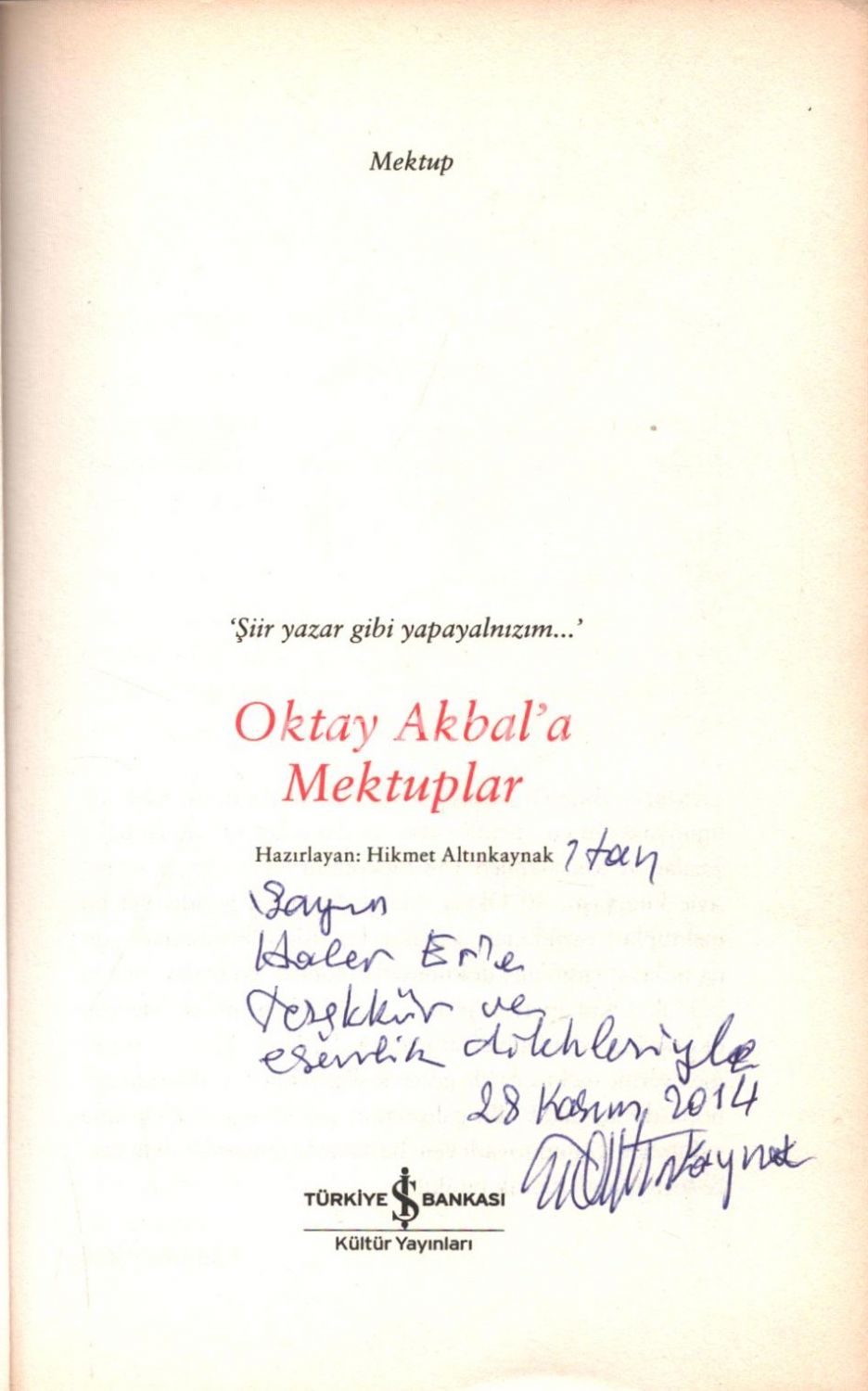 OKTAY AKBAL´A MEKTUPLAR, hazırlayan: Hikmet Altınkaynak, 2014, İş Bankası Kültür Yayınları, 323 sayfa, 13x20 cm, İTHAFLI VE İMZALI...