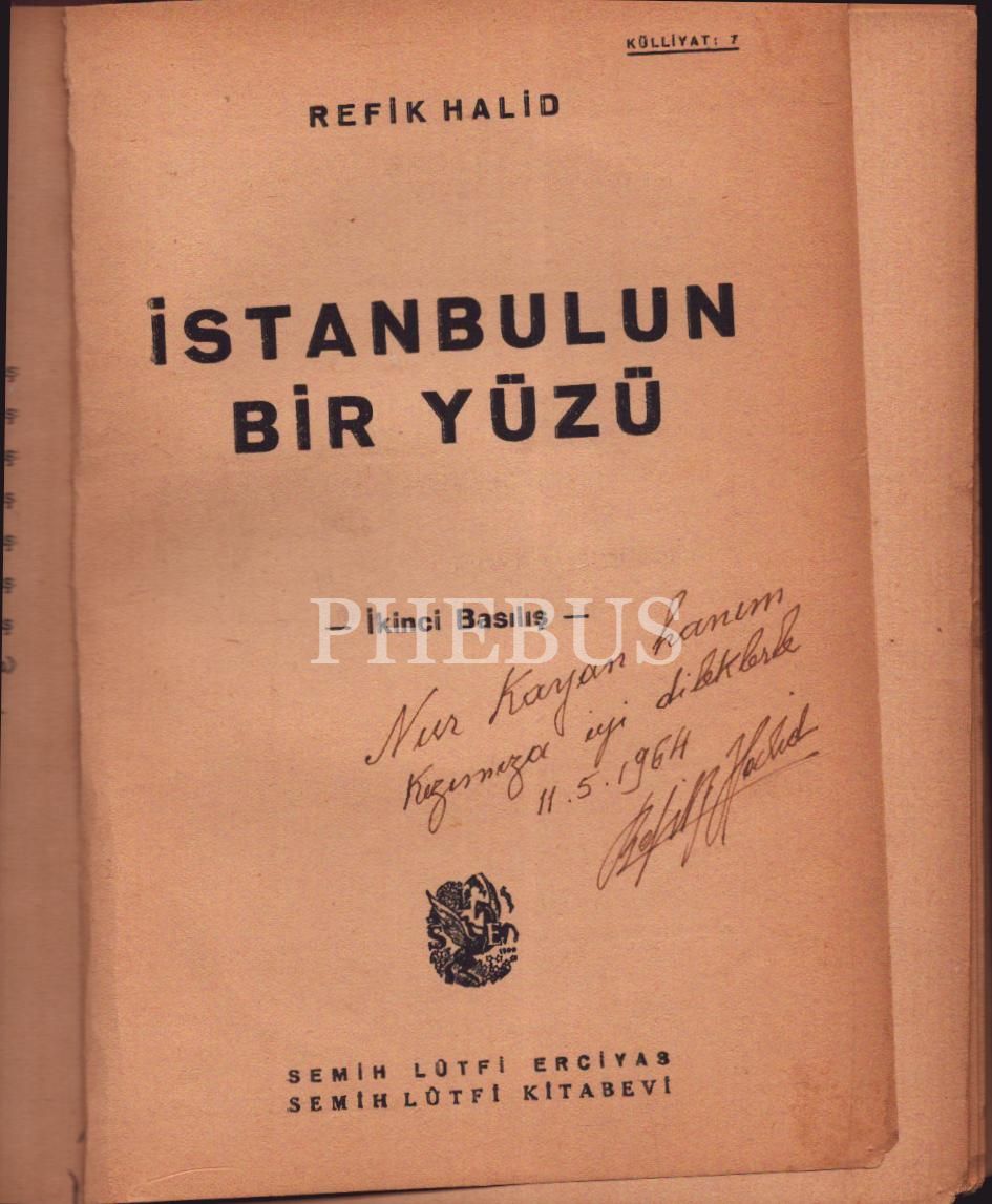 İthaf, "Nur Kayan hanım kızımıza iyi dileklerle. 11.5.1964. Refik Halid" şeklindedir.