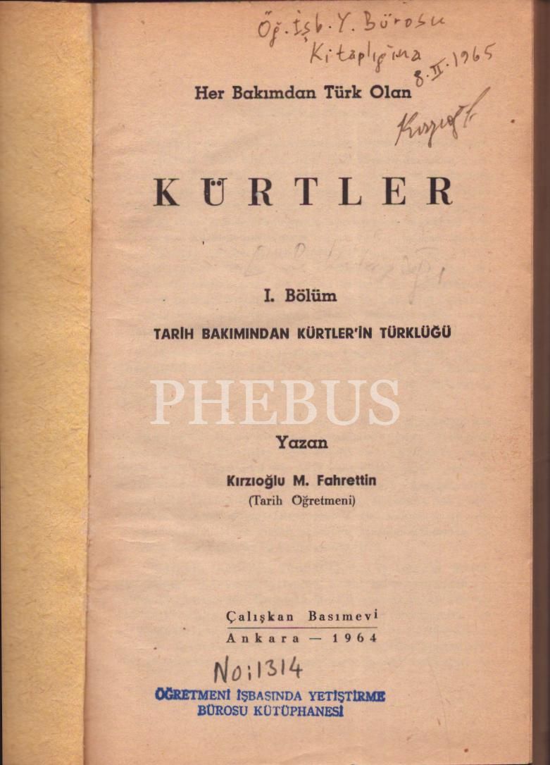 KÜRTLER, Kırzıoğlu M. Fahrettin, 1964, Çalışkan Basımevi, 123 sayfa, 12x19 cm, İTHAFLI VE İMZALI...