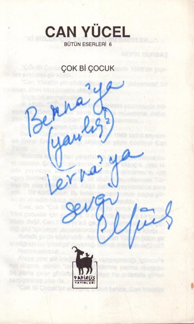 ÇOK Bİ ÇOCUK, Can Yücel, Kasım 1992, Papirüs Yayınları, 60 sayfa, 13x20 cm, İTHAFLI VE İMZALI...