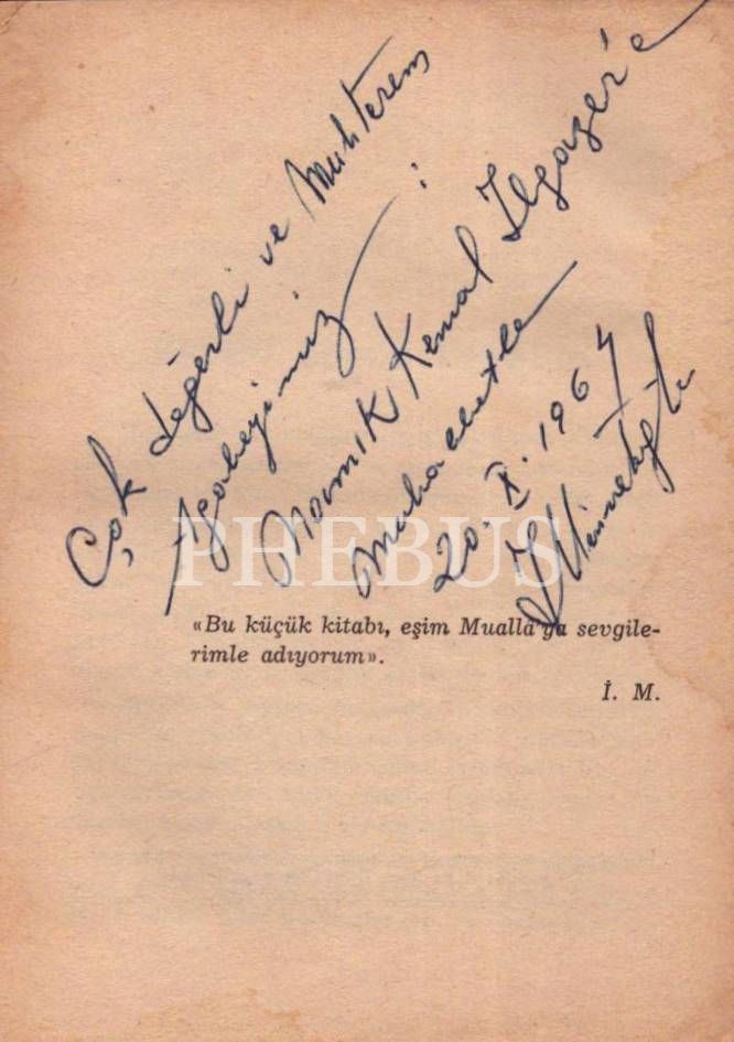 İthaf, "Çok değerli ve muhterem ağabeyimiz: Namık Kemal Ilgazer´e muhabbetle 20.X.1964" şeklindedir. *Kitap sırttan kısmen ayrılmış ve sayfaları açılmamıştır.