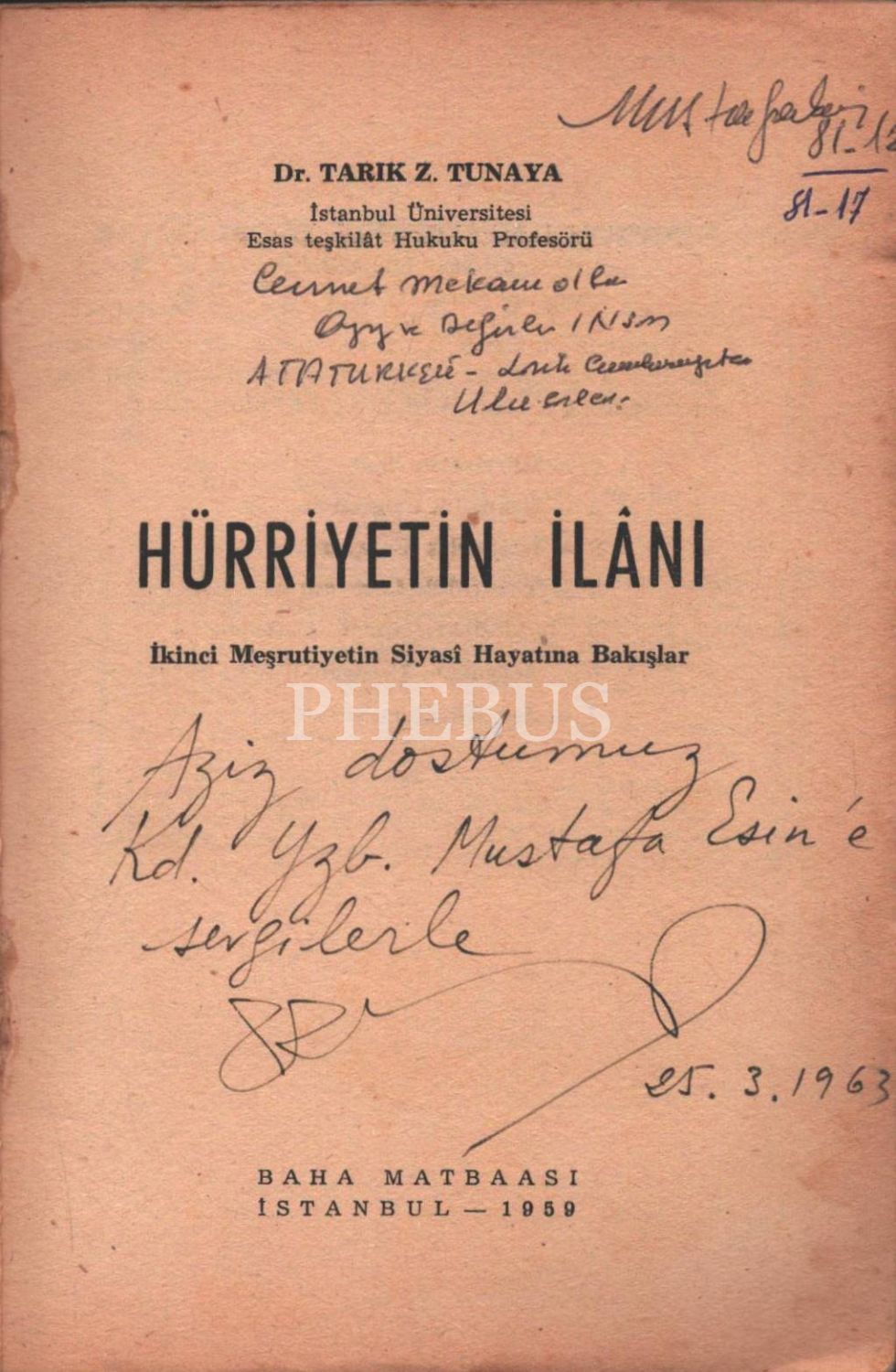 HÜRRİYETİN İLANI, Tarık Z. Tunaya, 1959, Baha Matbaası, 112 sayfa, 14x20 cm, İTHAFLI VE İMZALI...