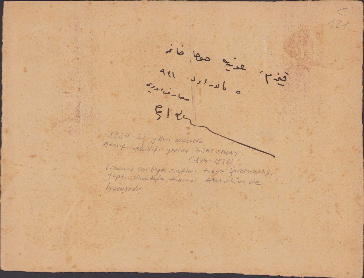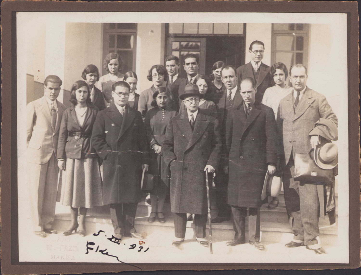 1930-1932 yılları arasında Maarif Vekilliği yapmış Esat Sagay Manisa'da cemiyet içinde. Sagay Erkan-ı harbiye sınıfları tabya öğretmenliği yaptı. Mustafa Kemal Atatürk'ün de hocasıdır. 1931 tarihli, Manisa adresli, 26x20 cm