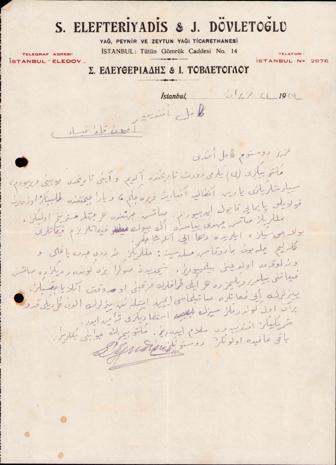 Türkçe - Rumca S. Elefteriadis & J. Dövletoğlu - Yağ, Peynir, ve Zeytin Yağı Ticarethanesi, İstanbul antetli 1929 tarihli Osmanlıca yazılı doküman, 20x28 cm