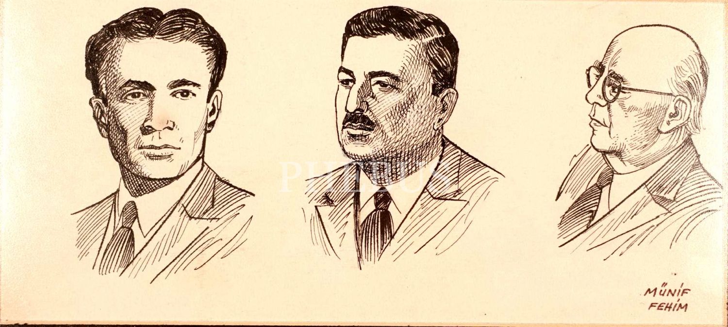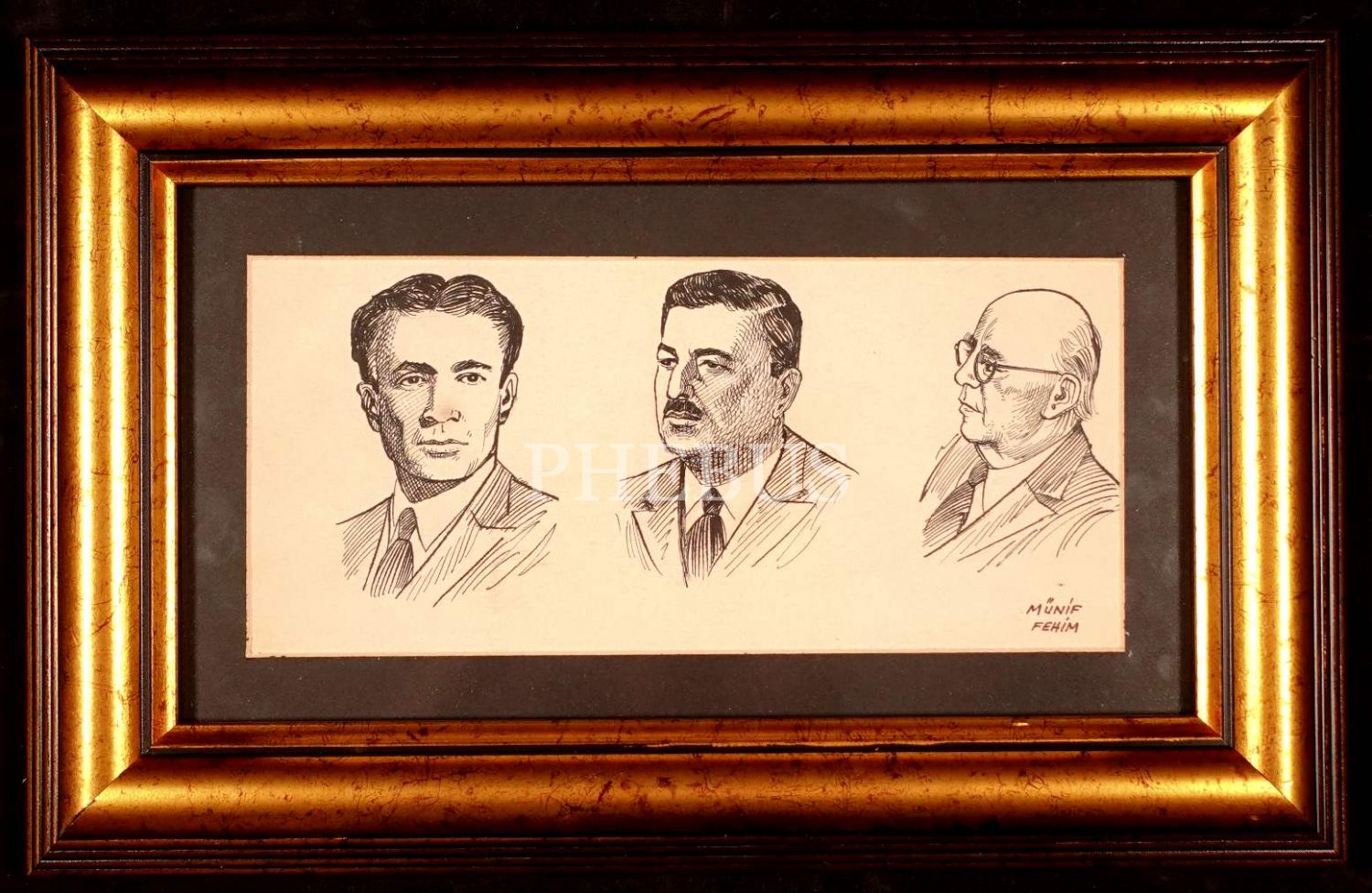 Münif Fehim imzalı, orijinal çizim... Kâğıt üzerine çini mürekkebiyle çizilmiş; Hüseyin Cahit Yalçın, Ercüment Ekrem Talû ve Ömer Bedrettin Uşaklı portreleri (soldan sağa)... Çerçevesiyle birlikte 36x23 cm...