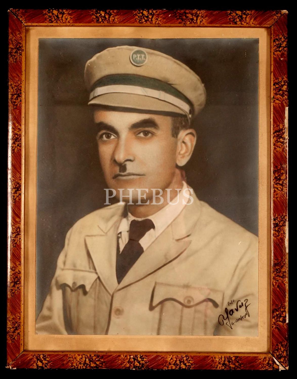 1 Temmuz 1951 tarihli, üniformalı P.T.T. memuru fotoğrafı, elle renklendirilmiş, "Foto Yavuz - G. Antep" imzalı, arka yüzü açıklamalı, çerçevesiyle birlikte 37x47 cm...