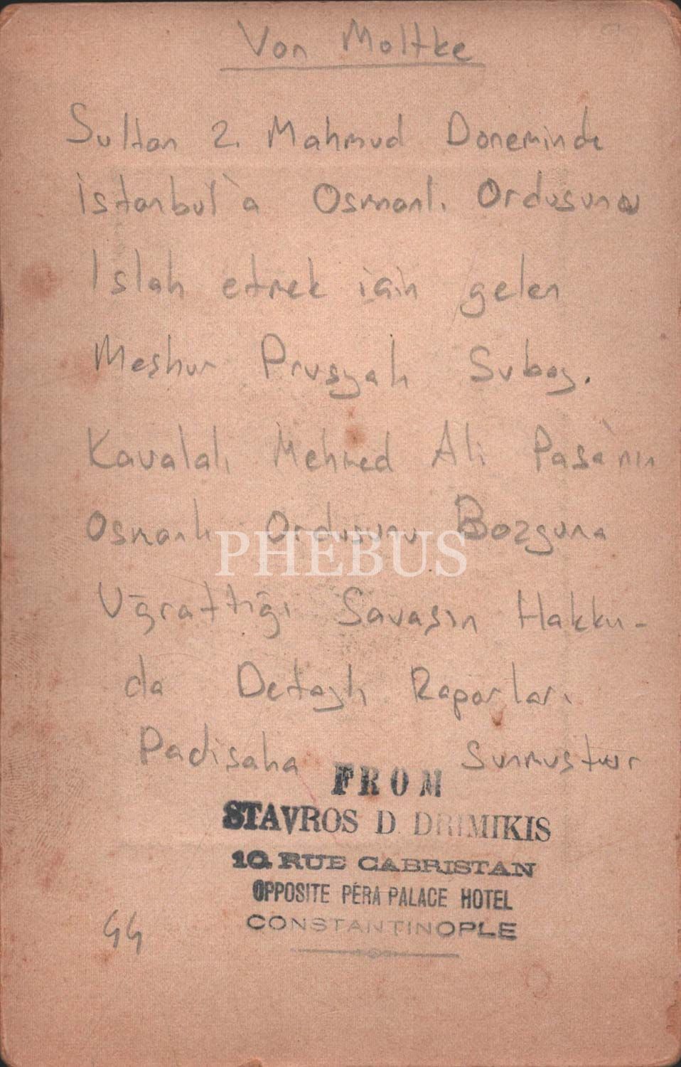 Sultan İkinci Mahmud döneminde Osmanlı ordusunu modernize etmek için İstanbul´a gelen meşhur Prusyalı subay Von Moltke, Stavros D. Drimikis Fotoğrafhanesi, 10,5x16,5 cm...