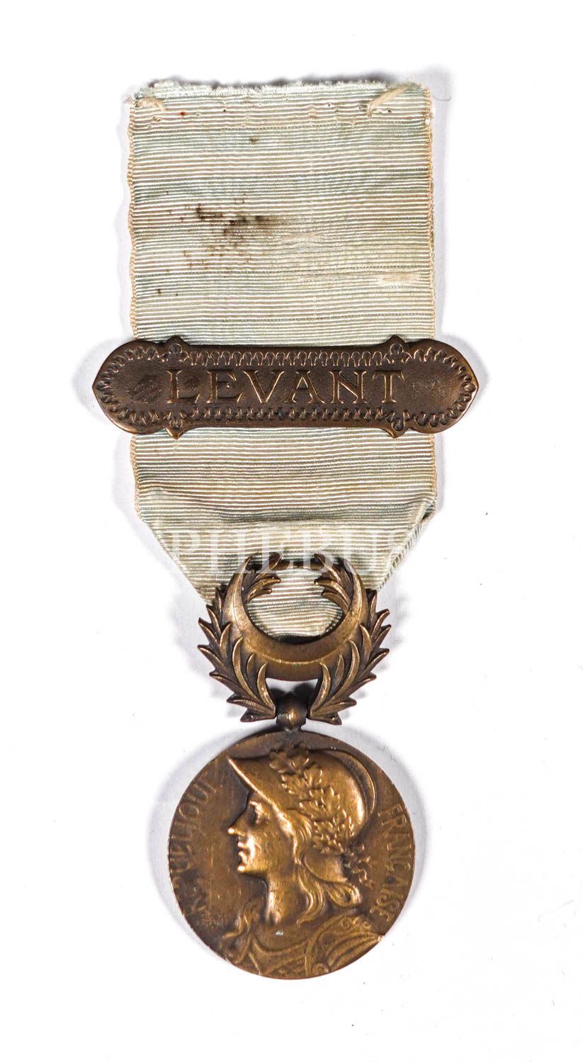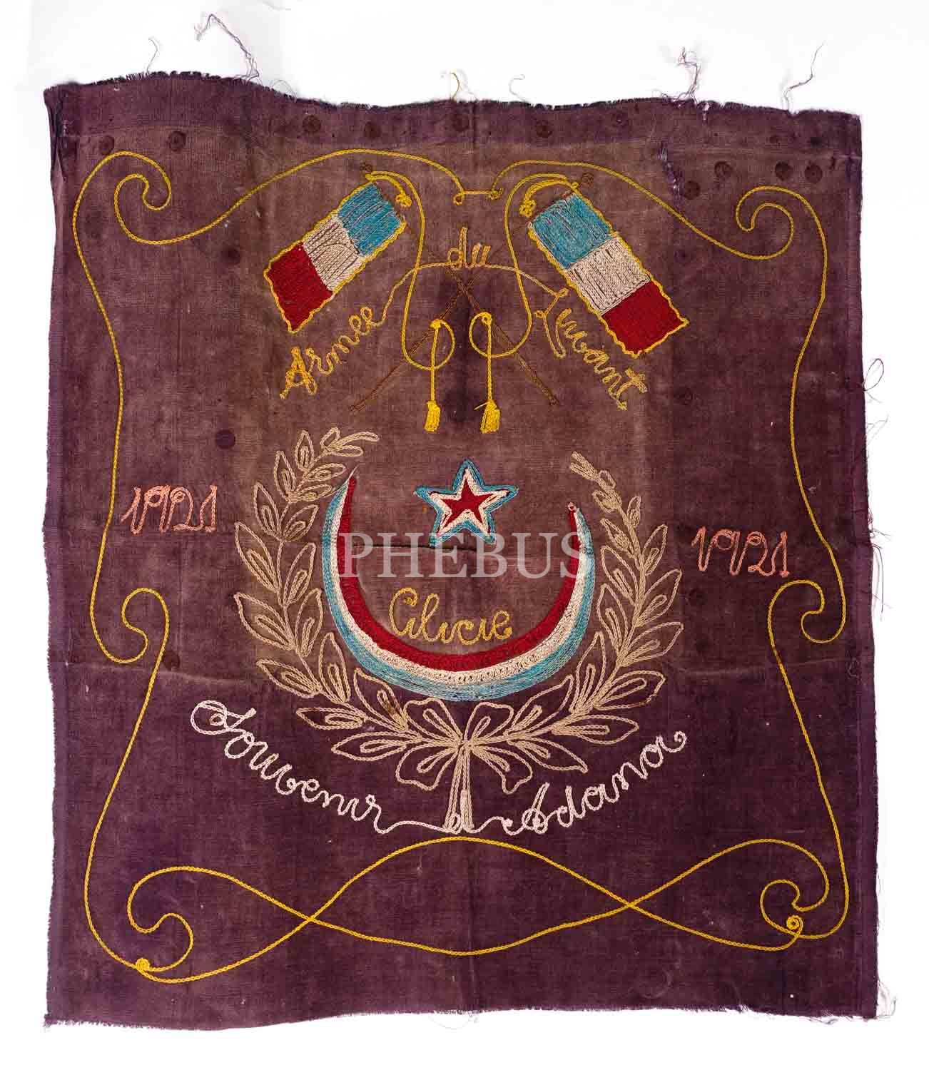 İşgal döneminden kadife üzerine "Adana (Cilicie) Souvenir" yazılı örtü (44x48 cm) ve bir adet Levant Orduları, bir adet de Fransız Orduları madalyası...