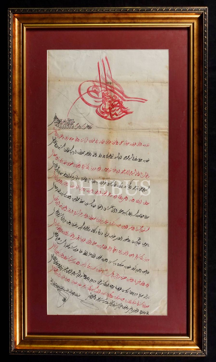 Sultan Abdülmecid el çekme tuğralı, Bursa Harmancık´da Mevlevi İsmail Hakkı Türbesine Türbedar atama beratı, çerçevesiyle birlikte 42x72 cm...