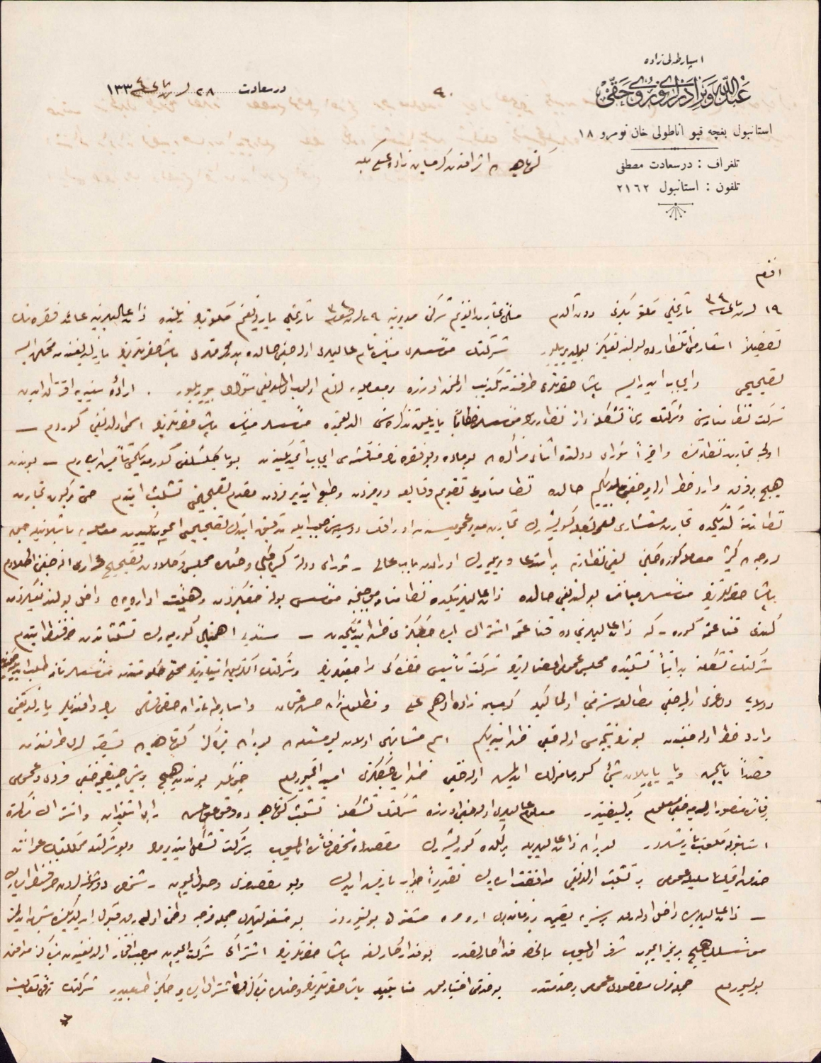 Osmanlıca Ispartalı Zade Abdullah ve Biraderleri Nuri ve Hakkı, İstanbul antetli doküman, 1334 tarihli, 20x28 cm