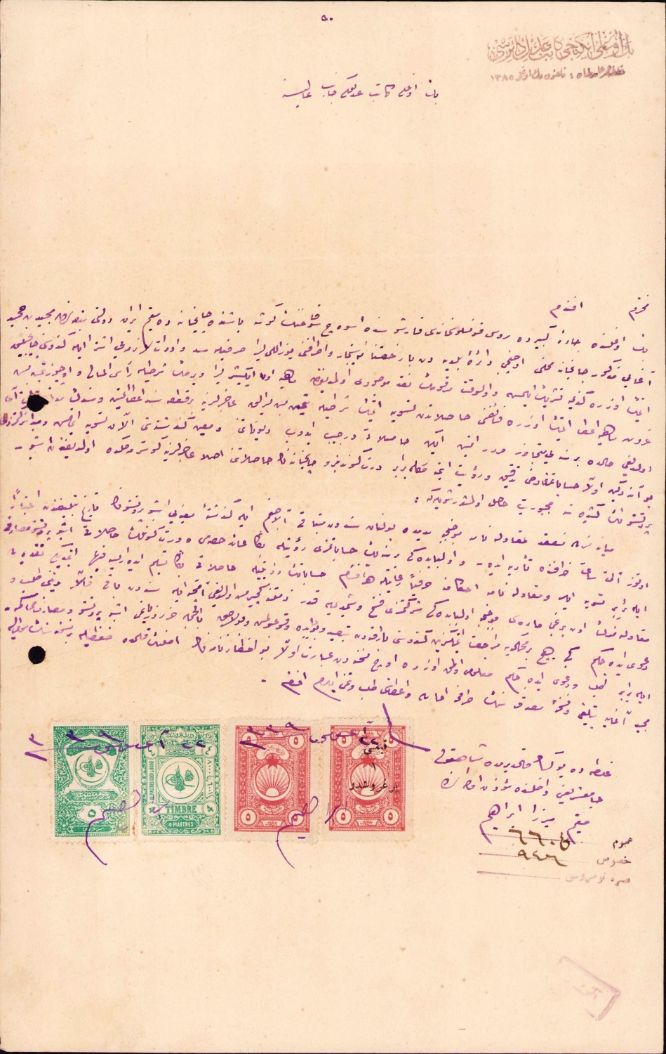 Osmanlı vekaletname, Beyoğlu İkinci Katip Adline ait Mirza İbrahim'e ait 1339 tarihli, bol pullu evrak, damgalı, imzalı, 20x33 cm