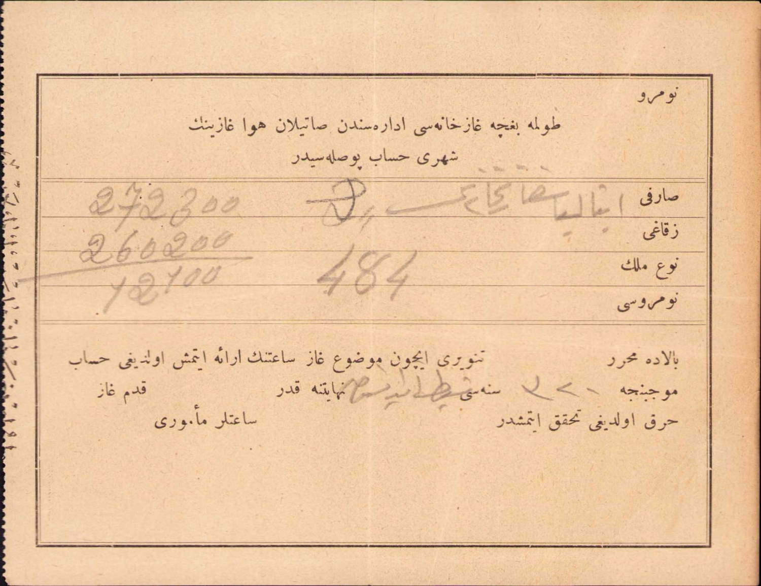 Osmanlı Dolmabahçe Gazhanesi idaresinden satılan hava gazının şehri hesap pusulası, 16x12 cm