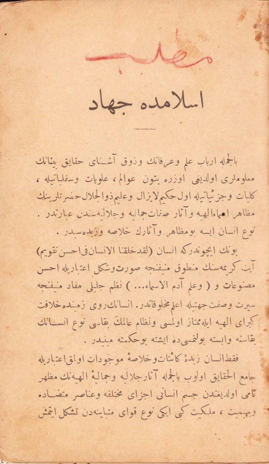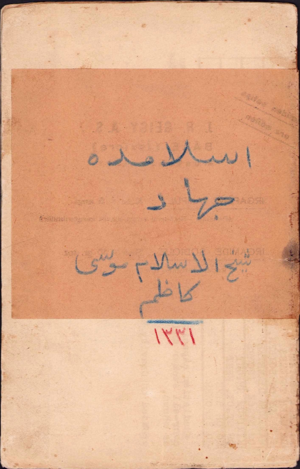 Osmanlıca İslamda Cihad, Şeyhülislam Musa Kazım, 1331, kapak eksik haliyle, 23 sayfa, 12x18 cm