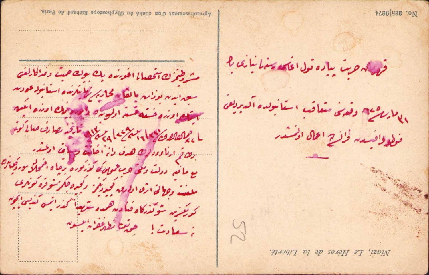 arkasında Osmanlıca Niyazi Beyin hürriyet yolunde verdiği mücadelelere yönelik yazılar vardır. Arnavut isyanından bahsetmektedir.