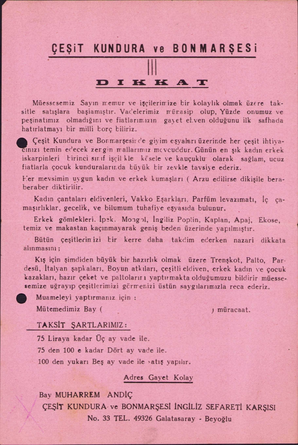 Çeşit Kundura ve Bonmarşesi el ilanı, 16x24 cm