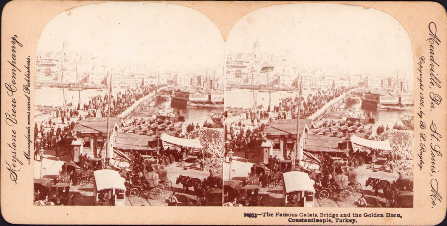 Osmanlı dönemi stereoview, Galata Köprüsü ve Haliç, 17x9 cm