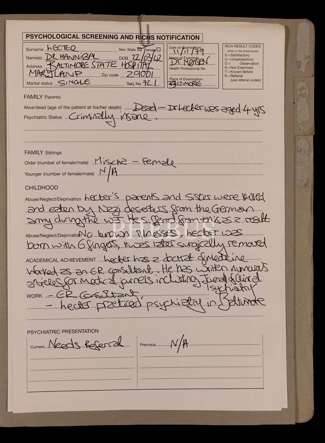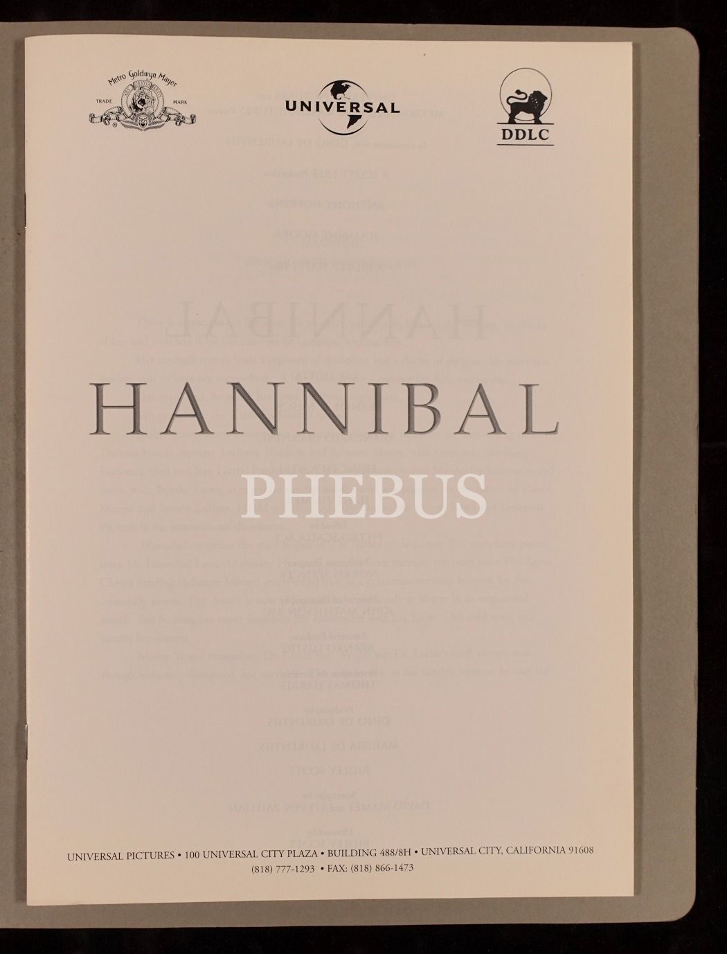 HANNIBAL filminin filmde kullanılan materyallerin tıpkıbasımlarını da ihtiva eden, basın için dağıtılan tanıtım broşürü, 25x32 cm...
