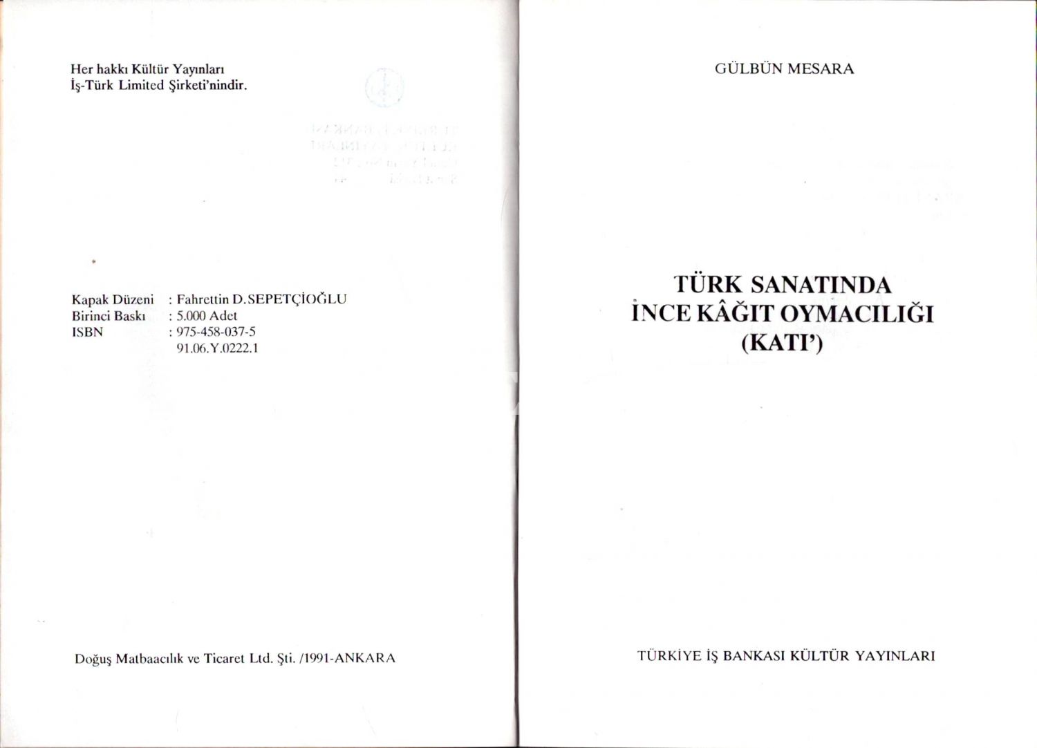 TÜRK SANATINDA İNCE KAĞIT OYMACILIĞI (KATI´), Gülbün Mesara, 1991 Ankara, Türkiye İş Bankaı Kültür Yayınları, 102 sayfa, 14x20 cm...