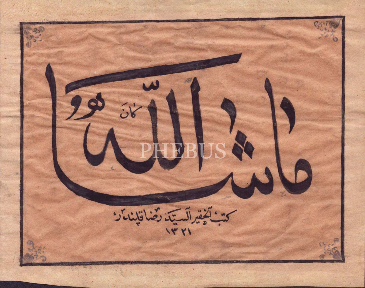 Seyid Rıza Kalender ketebeli 1321 tarihli sülüs yazı, "Maşallahû Teâlâ Kâne", 21x16 cm...