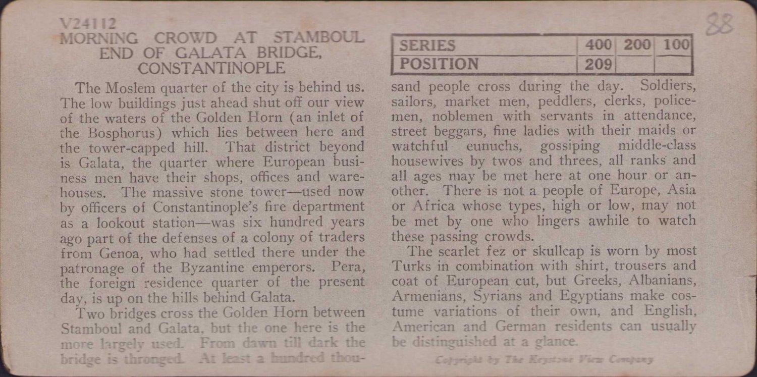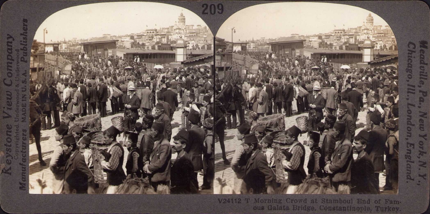 Osmanlı dönemi stereoview, Galata Köprüsünde sabah kalabalığı, 17x9 cm