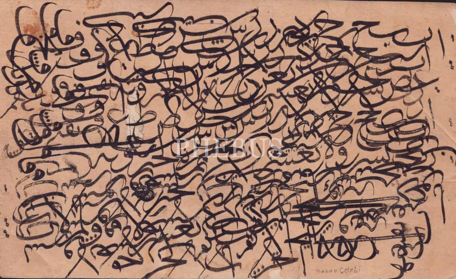 Sülüs karalama çalışması, alt bölümde "Hasan Çelebi" notu mevcut, 21x13 cm...