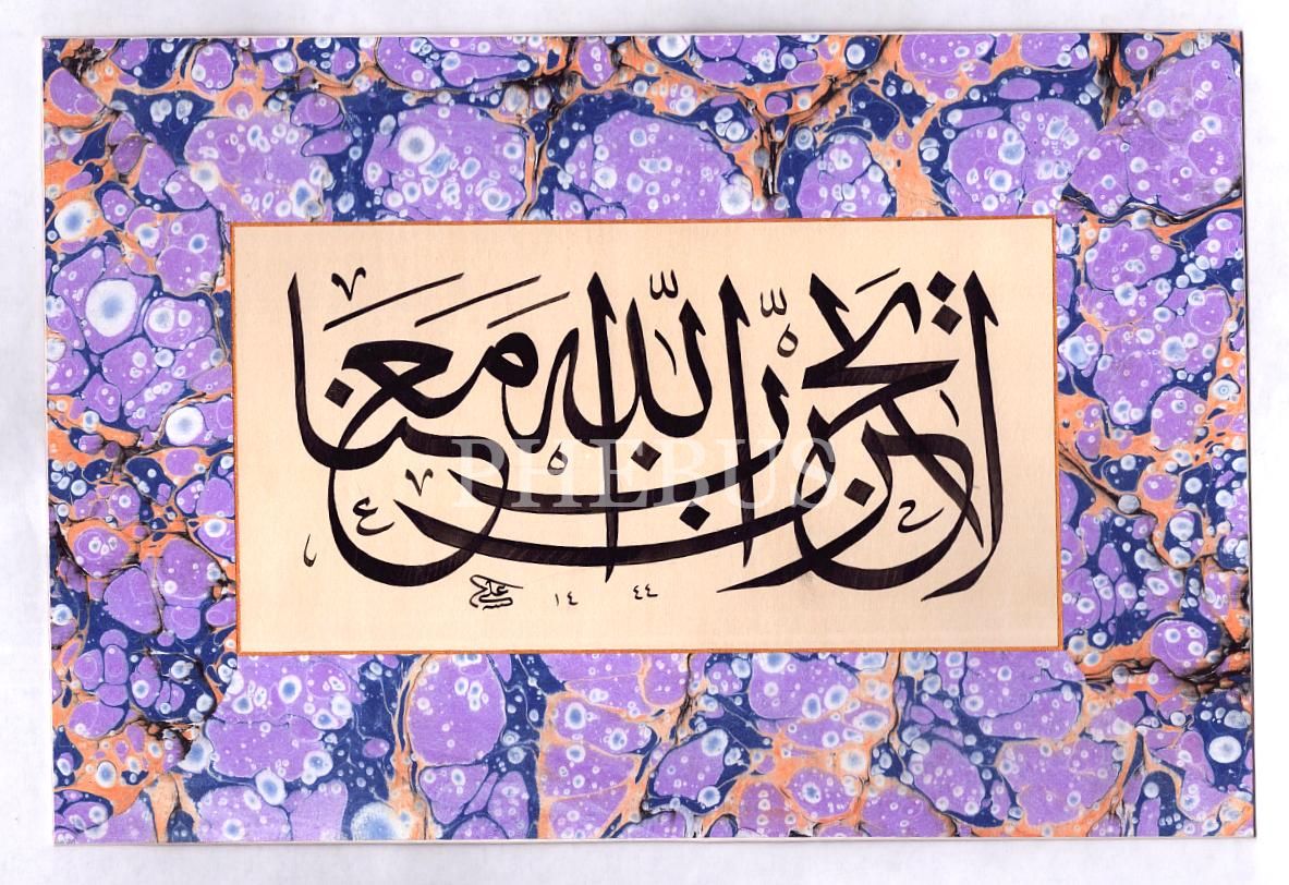 Ali Hüsrevoğlu ketebeli 1444 tarihli ebru pervazlı sülüs levha, 36x24 cm...