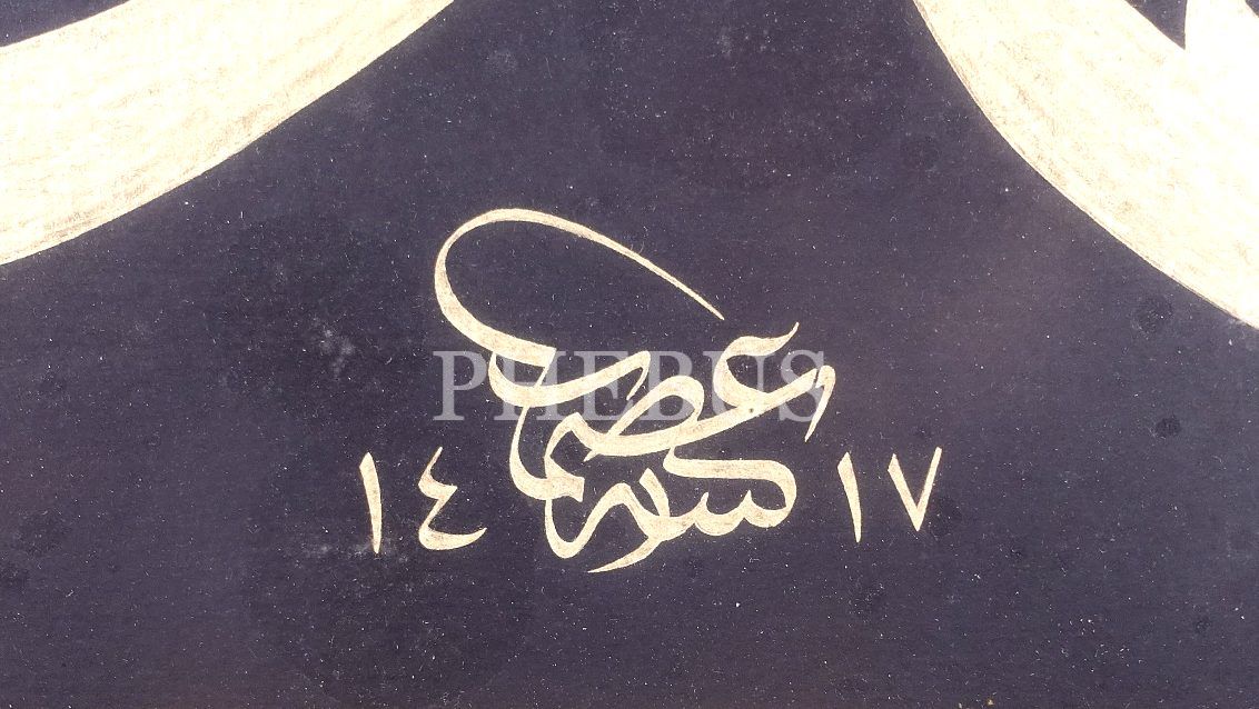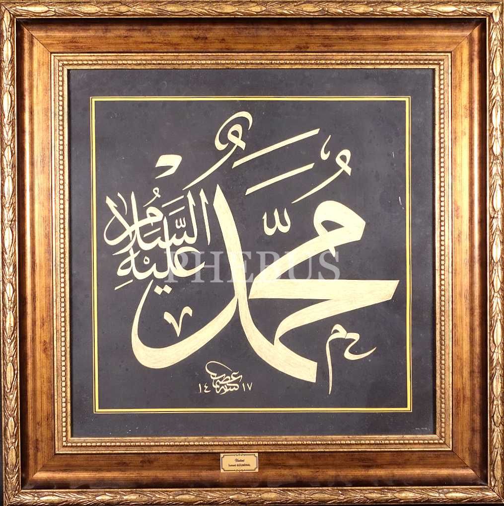 İsmet [Gülnihal] ketebeli 1417 tarihli zerendûd celi sülüs "Muhammet Aleyhisselam" yazılı levha, 66x66 cm...