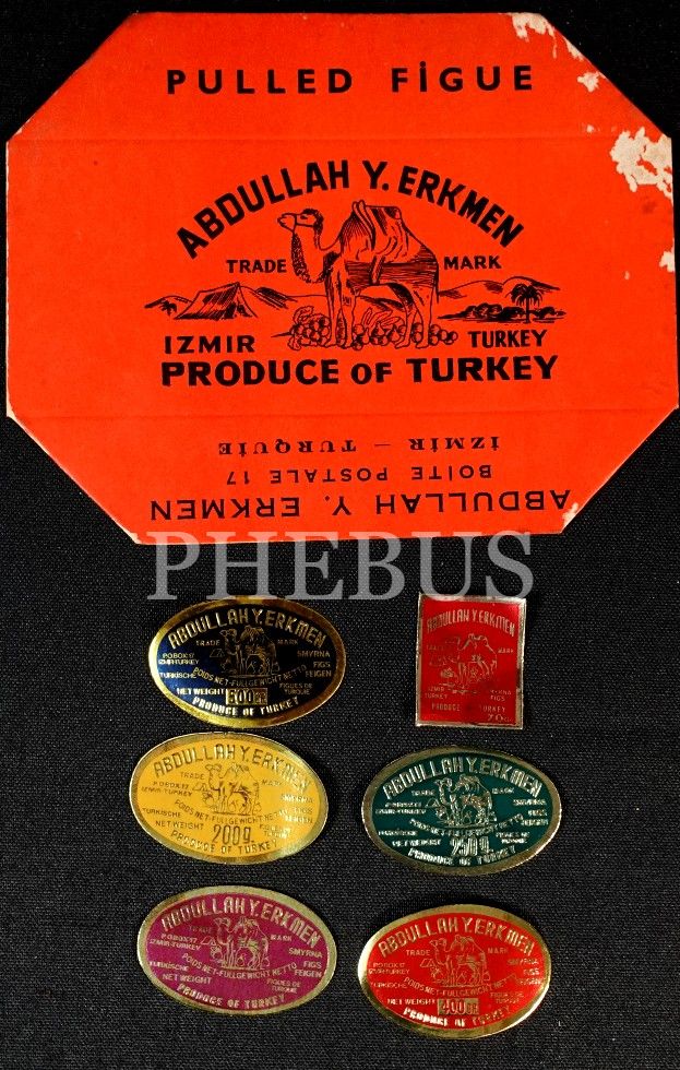 "ABDULLAH Y. Erkmen (İzmir)" incir kutusu kapağı ve altı adet etiket, kapak 17x13 cm, etiket 4x3 cm (ortalama)...