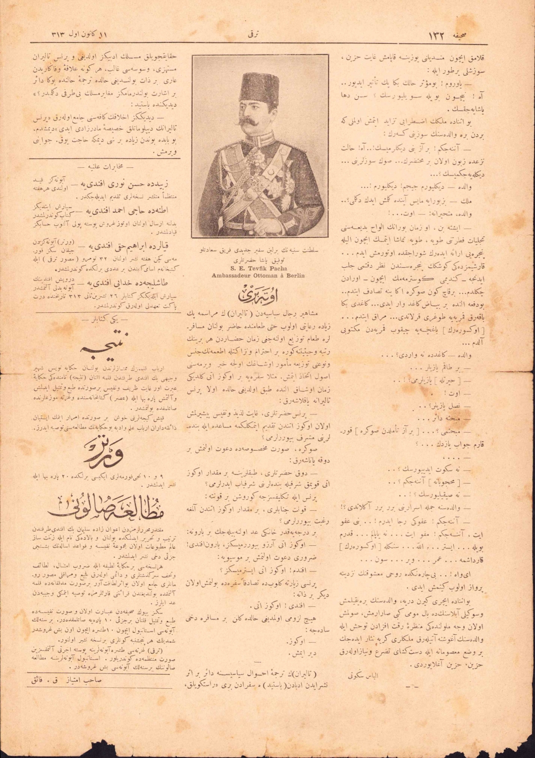 Osmanlıca Terakki gazetesi, görsel "Tophane-i Amire Müşir Zeki Paşa", hicri 1313, 4 sayfa, 28x42 cm.