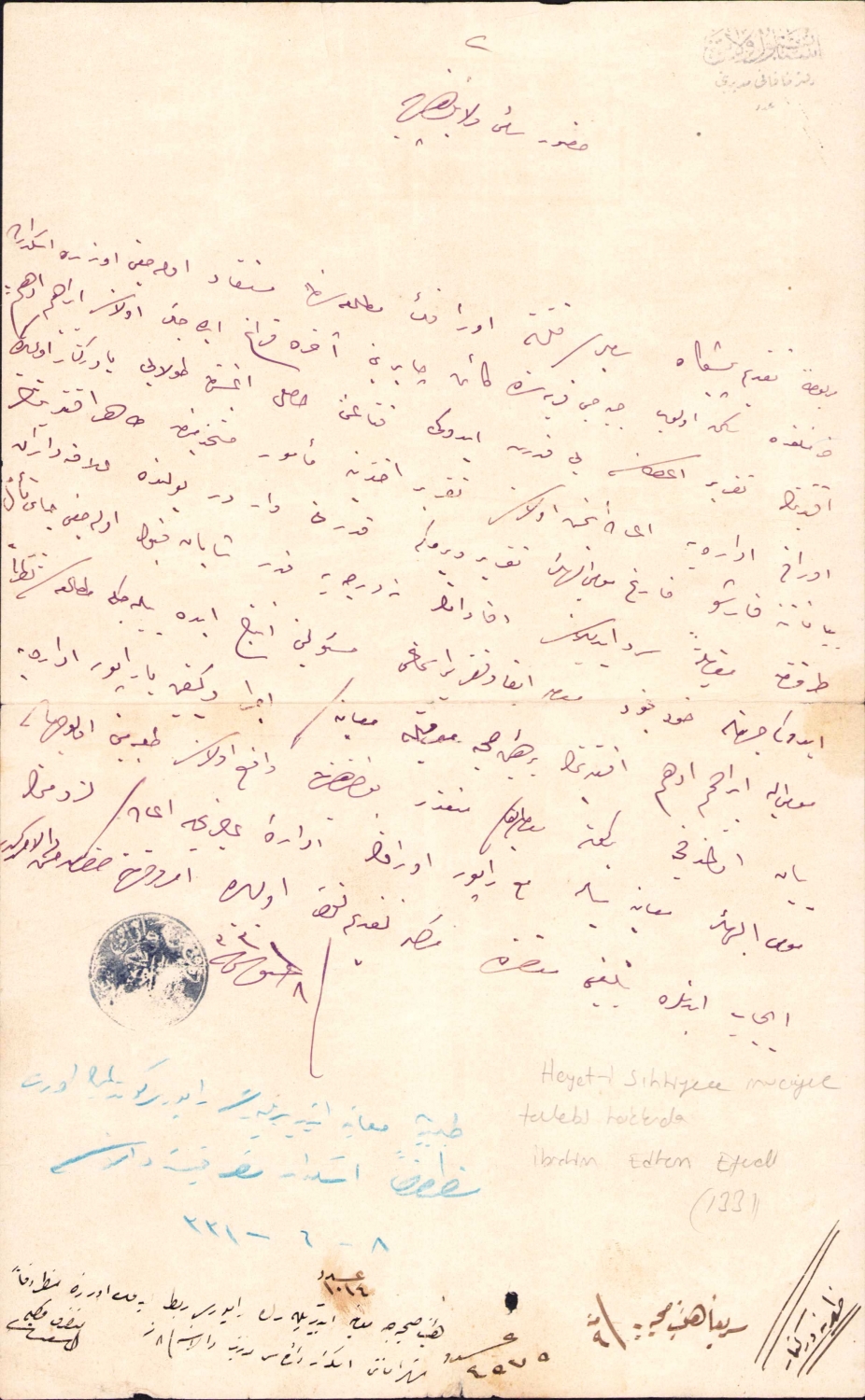 Osmanlıca İbrahim Ethem Efendinin heyet-i sıhhıye talebi hakkında 1331 tarihli evrak, 20x34 cm