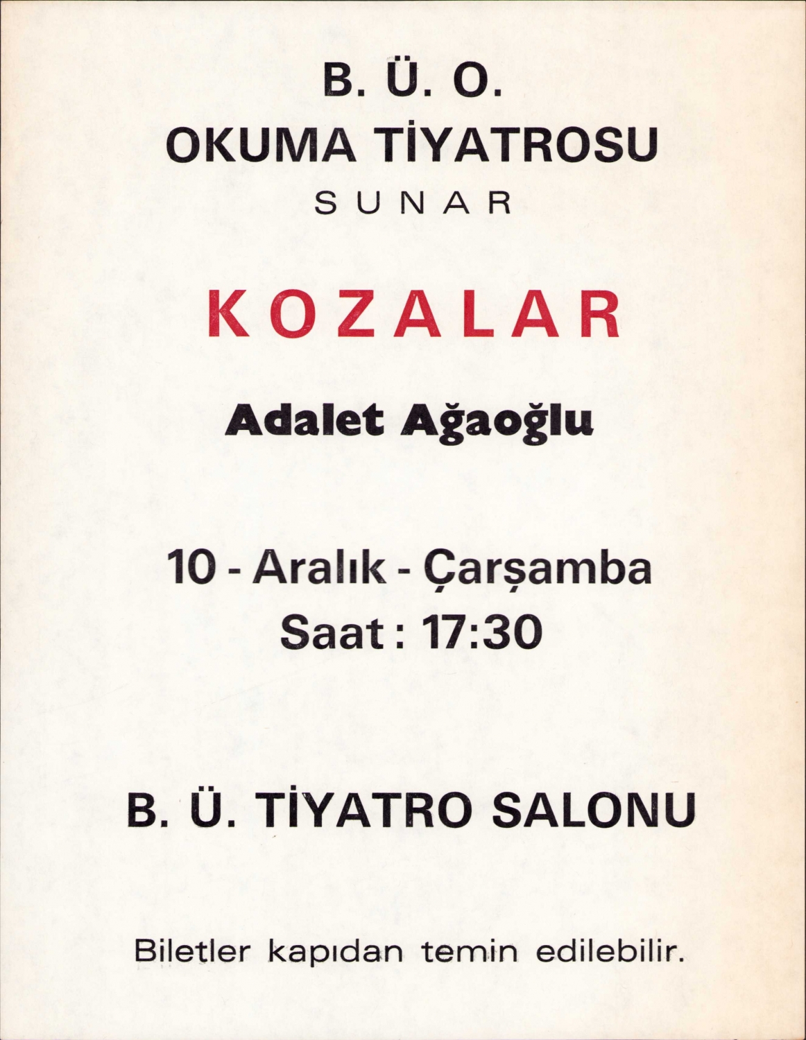 B. Ü. O. Okuma Tiyatrosu, Kozlar - Ahmet Ağaoğlu tanıtım afişi, 23x30 cm