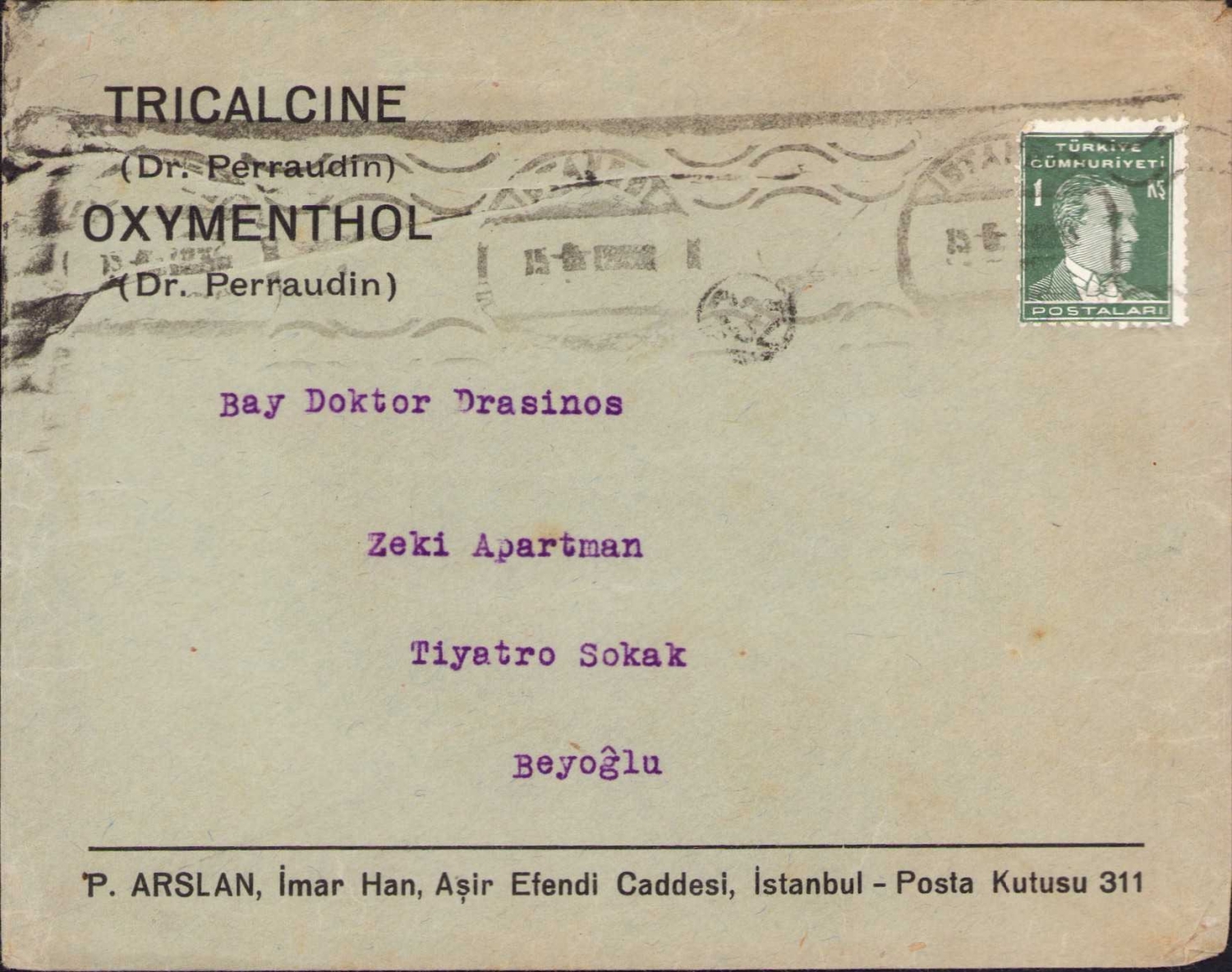 Tricalcine Oxy Menthol antetli, postadan geçmiş zarf